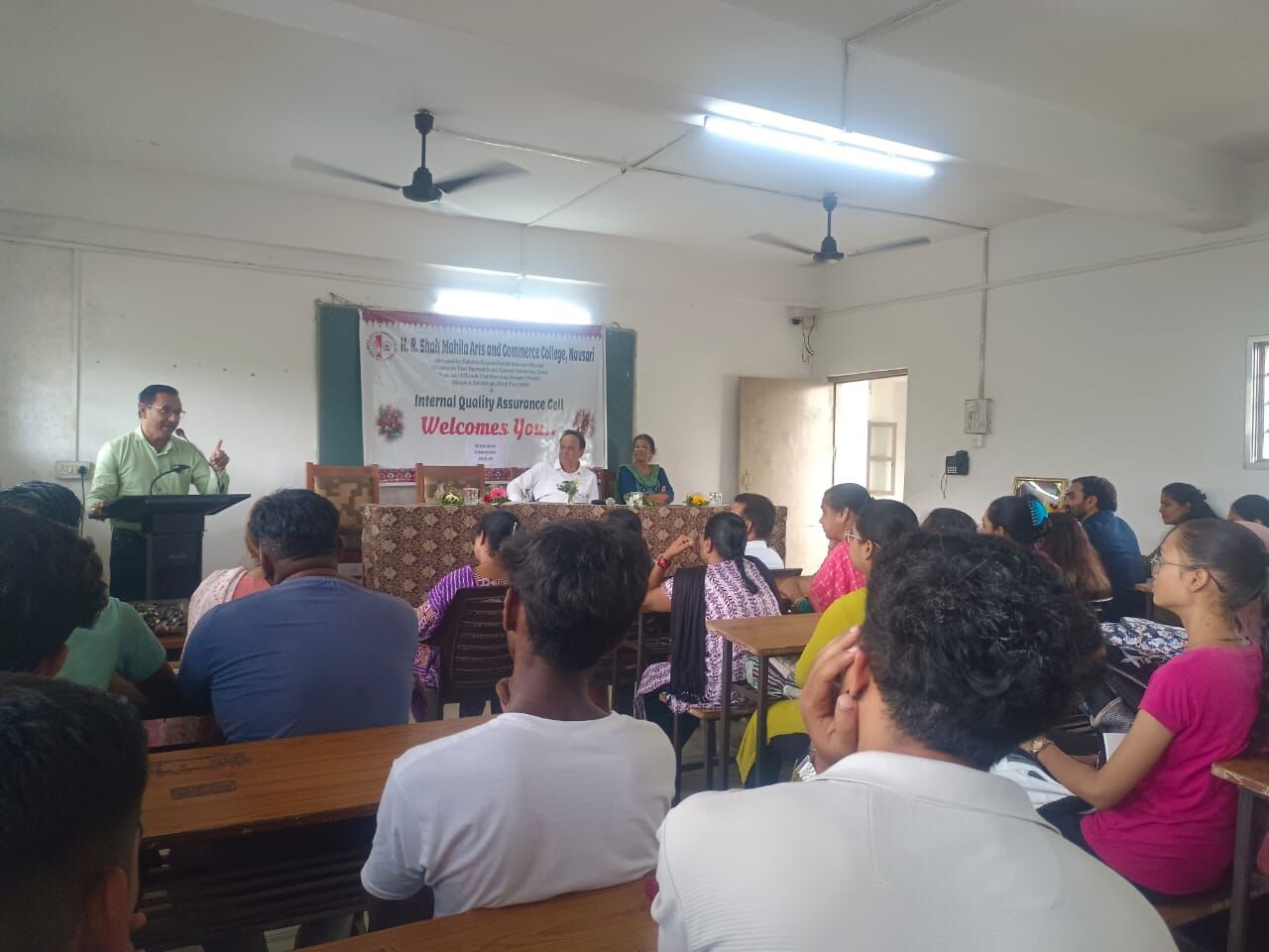 Orieantation program was held on 19/7/2025 for new admission first year students . The program was honoured with our institution trustree Shri. Ashok Shah Sir and as a chief guest we had Dr. Hitendrasinh Kharwasia, principal sir of R. P. Chauhan Arts and Commerce college, Vyara. The program was coordinated by Dr. Smeeta Mistry, under the able guidance of Principal Mrs. Varsha Patel and Vice Principal Dr. Girish Vaghela. Nearly 150 students were present. The students were welcomed with sweet and pen.